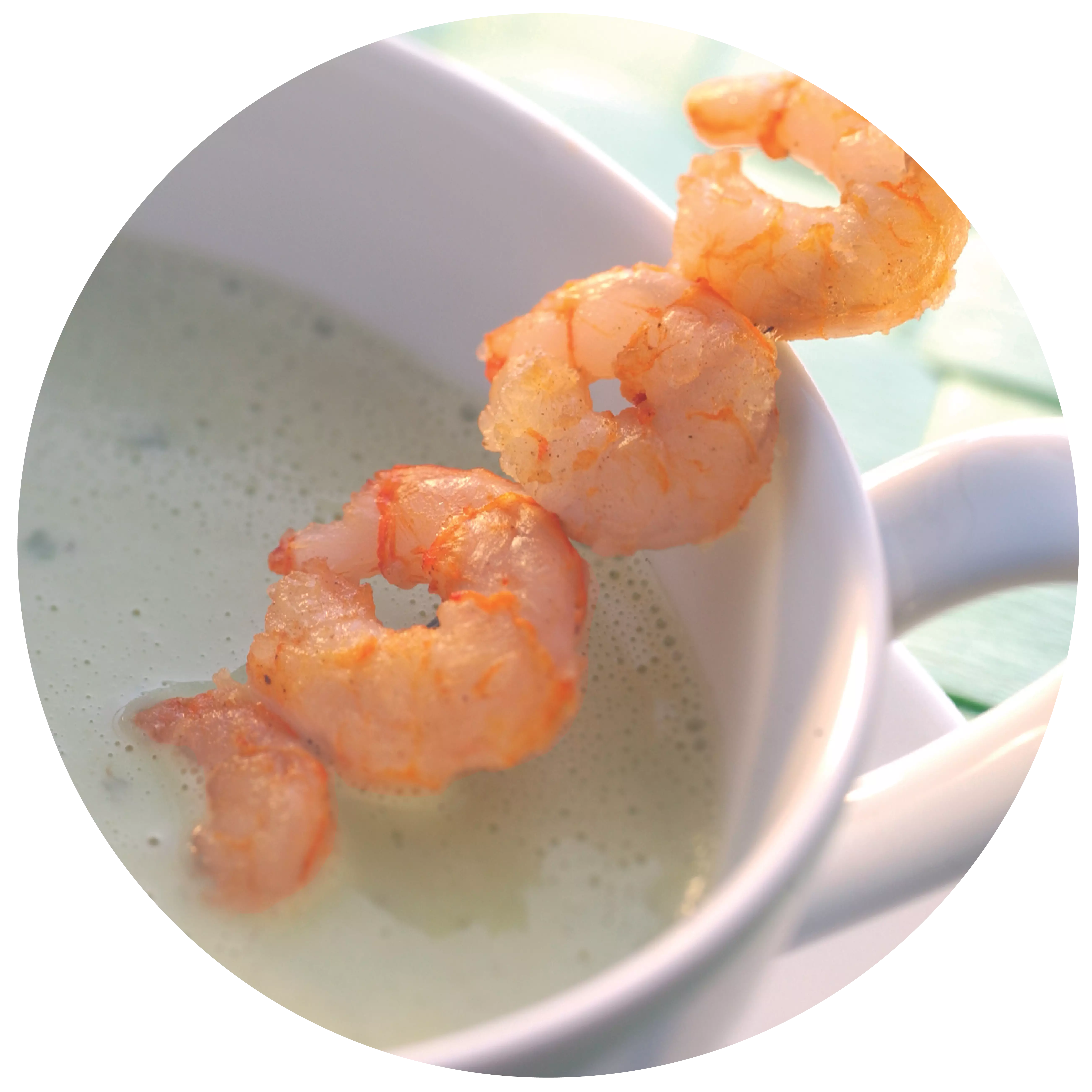 Nawlecz smażone krewetki na cienkie patyczki do szaszłyków (w razie potrzeby możesz również użyć drucika florystycznego) i umieść je w miseczkach pod kątem.